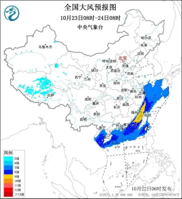预计,10月22日08时至23日08时,新疆北部和东部、西藏中北部、青海西南部、甘肃西部、辽东半岛、山东半岛、福建东部、广东南部、广西南部、海南岛等地部分地区有5~6级风,阵风7~8级;黄海南部海域、东海北部海域、北部湾、琼州海峡将有7~8级、阵风9~10级的大风,东海南部海域、台湾海峡、台湾以东洋面、巴士海峡、南海北部和中西部海域将有8~10级、阵风11~12级的大风。