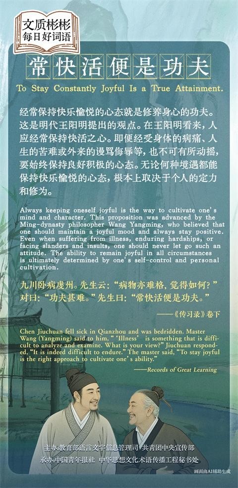 Always keeping oneself joyful is the way to cultivate one's mind and character. This proposition was advanced by the Ming-dynasty philosopher Wang Yangming, who believed that one should maintain a joyful mood and always stay positive. Even when suffering from illness, enduring hardships, or facing slanders and insults, one should never let go of such an attitude. The ability to always remain joyful is determined by one's self-control and personal cultivation.