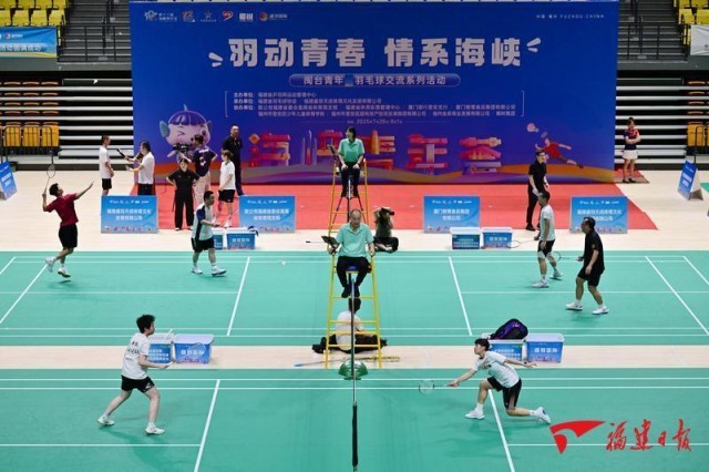闽台青年羽毛球友谊赛举行,来自台湾的青年运动员在赛场上激情挥拍。 福建日报记者 施辰静 摄