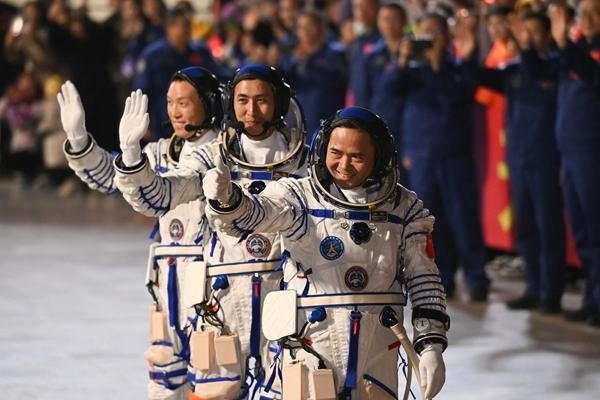 随着《歌唱祖国》的乐曲奏响,观众挥动的鲜艳花束和五星红旗点亮了圆梦园广场的夜晚。3名航天员登上开往发射场区的专车。
