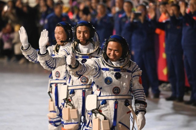 神舟二十一号航天员张陆、武飞、张洪章领命出征。