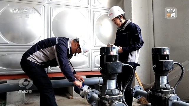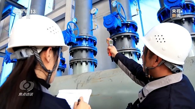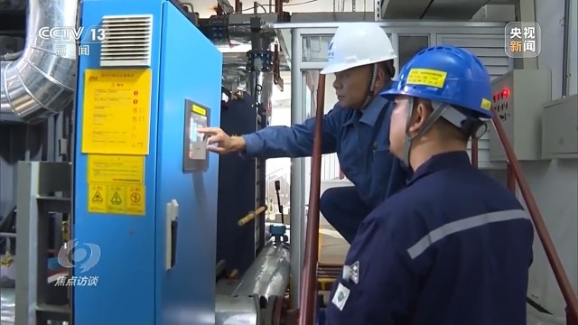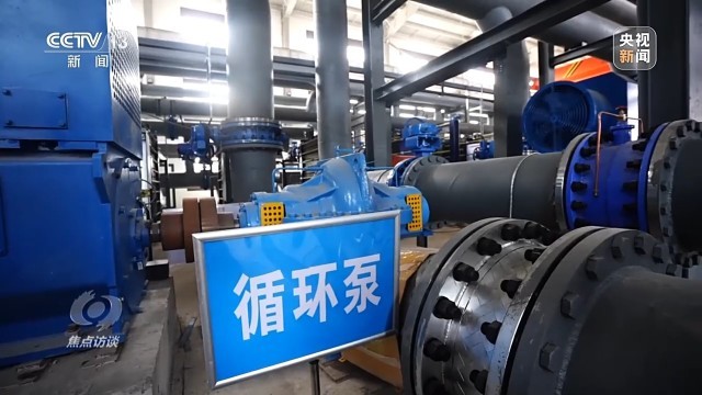 地热能源站是整个清洁热源项目的枢纽。地热水从地下1500米抽上来,要先在地热能源站提取热量,再用这些热量加热自来水,然后把加热好的水通过管道送到居民家实现供暖。工作人员现在正在检测的正是往百姓家送水的出水口温度,这个温度高低直接决定了居民家里暖不暖。