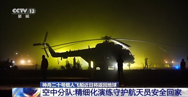 在神舟二十号飞船返回前的最后一次全系统全要素合练中,夜幕降临,搭载多支搜救力量的五架直升机接力起飞,奔赴指定空域待命。随后,根据落点预报,收拢飞行,快速抵达着陆点上空,第一时间精准降落在模拟返回舱附近。
