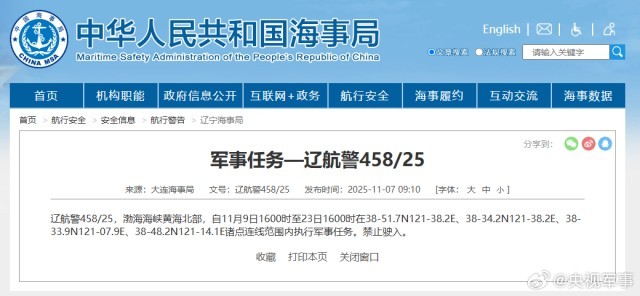 据中国海事局网站消息,大连海事局发布航行警告,11月9日16时至23日16时,渤海海峡黄海北部部分海域执行军事任务,禁止驶入。