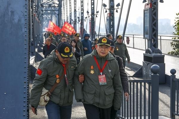 10月25日,辽宁丹东鸭绿江断桥,纪念中国人民志愿军抗美援朝出国作战75周年向志愿军烈士敬献花篮仪式举行。视觉中国供图