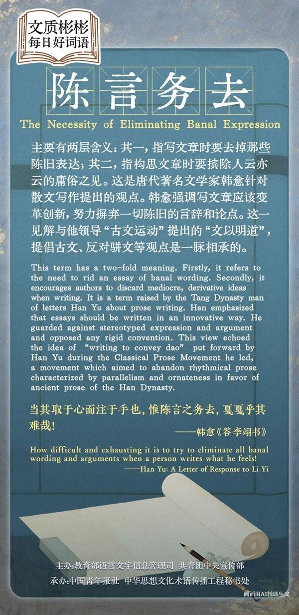 This term has a two-fold meaning. Firstly, it refers to the need to rid an essay of banal wording. Secondly, it encourages authors to discard mediocre, derivative ideas when writing. It is a term raised by the Tang Dynasty man of letters Han Yu about prose writing. Han emphasized that essays should be written in an innovative way. He guarded against stereotyped expression and argument and opposed any rigid convention. This view echoed the idea of "writing to convey dao" put forward by Han Yu during the Classical Prose Movement he led, a movement which aimed to abandon rhythmical prose characterized by parallelism and ornateness in favor of ancient prose of the Han Dynasty.