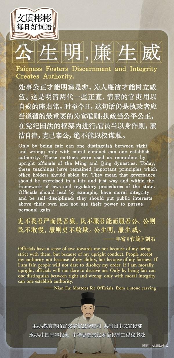引例吏不畏吾严而畏吾廉,民不服吾能而服吾公。公则民不敢慢,廉则吏不敢欺。公生明,廉生威。(年富《官箴》刻石)(官吏不害怕我的严厉但敬畏我廉洁,百姓不认可我的才能但信服我的公正。我公正,百姓就不会瞧不起我;我廉洁,官吏就不敢欺瞒于我。处事公正才能明察是非,做人廉洁才能树立威望。)