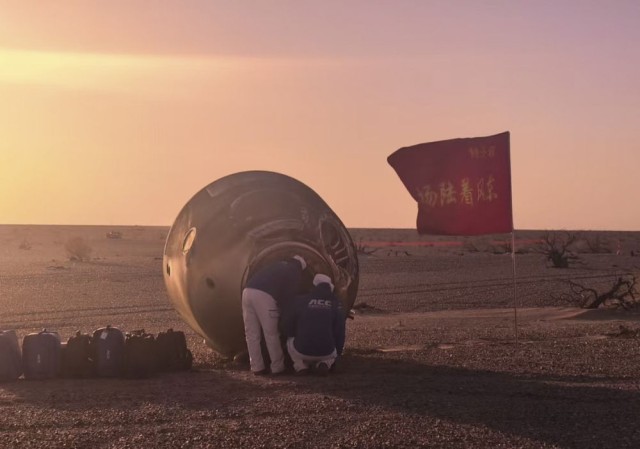 ↑11月14日,载着神舟二十号航天员乘组的神舟二十一号载人飞船返回舱在东风着陆场成功着陆。新华社发(汪江波 摄)