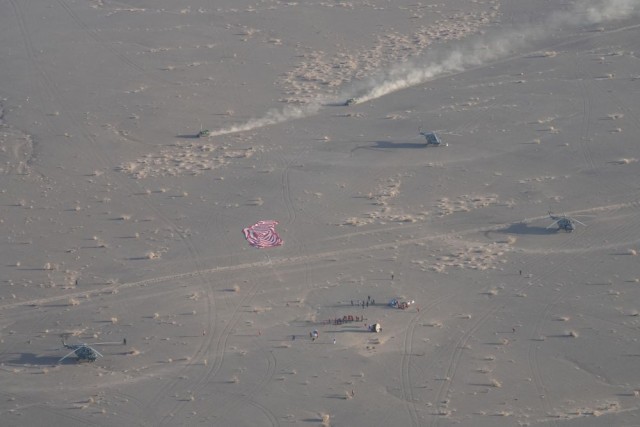 ↑11月14日,载着神舟二十号航天员乘组的神舟二十一号载人飞船返回舱在东风着陆场成功着陆。新华社记者李志鹏 摄