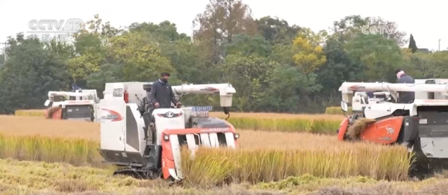 为了预防寒潮出现的雨雪天气影响,在江苏苏州市吴中区临湖镇的一处农场里,多台收割机正在进行水稻抢收作业,刚刚收获的水稻会立刻运往不远处的生产加工基地进行烘干作业。记者从苏州市农业农村局了解到,截至11月16日,当地已完成水稻收获113.84万亩,进度超过九成。
