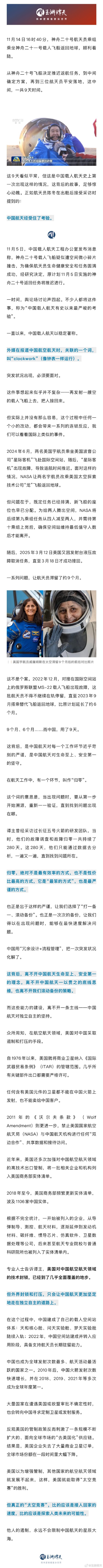 11月14日,神舟二十号航天员乘组乘坐神舟二十一号载人飞船返回地球,顺利着陆。从神舟二十号飞船决定推迟返航任务,到中间确定方案,再到三位航天员平安落地,这中间,一共9天时间。其他国家处理类似问题,用了9个月、6个月……中国是怎么做到的呢?