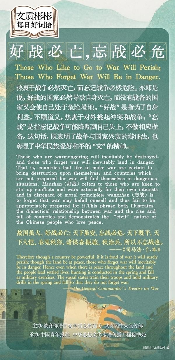 Those who are warmongering will inevitably be destroyed, and those who forget war will inevitably land in danger. That is, countries that like to make war are certain to bring destruction upon themselves, and countries which are not prepared for war will find themselves in dangerous situations. Haozhan refers to those who are keen to stir up conflicts and wars externally for their own interests and in disregard of moral principles; wangzhan is to forget that war may befall oneself and thus fail to be appropriately prepared for it. This phrase both illustrates the dialectical relationship between war and the rise and fall of countries and demonstrates the "civil" nature of the Chinese people who love peace.