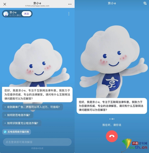 “您好!我是‘京小e’,专注于互联网法律科普,我致力于为您提供权威、专业的法律解答……”打开“京小e”服务页面可爱的卡通形象映入眼帘,亲切的语言风格让人感到温暖。值得关注的是,这个智能普法助手已通过54万字权威专业内容训练,能精准回应网民法律需求。