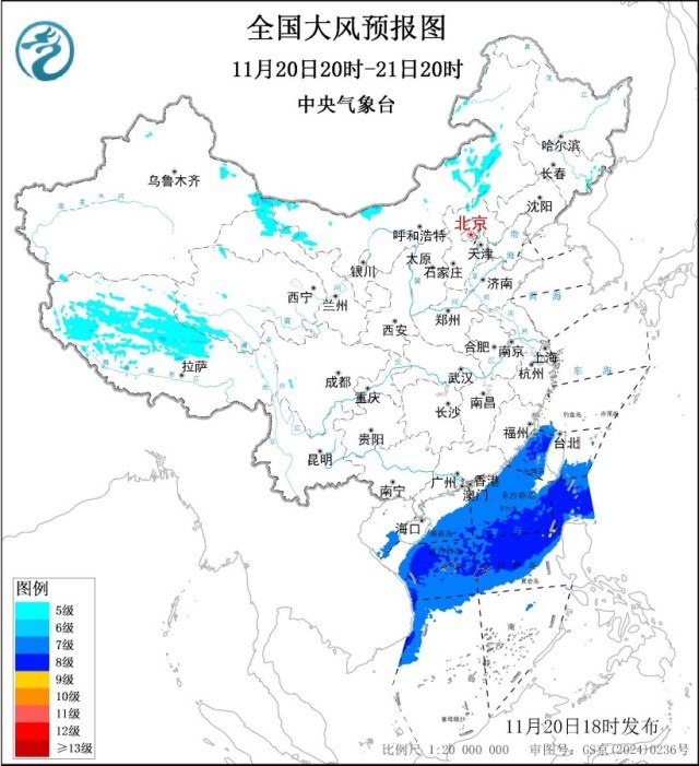 央视网消息:中央气象台11月20日18时继续发布大风蓝色预警:预计,11月20日20时至21日20时,内蒙古东部和西部、甘肃西部、西藏西部等地部分地区将有5~6级风,阵风7~8级;台湾海峡、巴士海峡、南海北部和中部海域将有7~8级、阵风9级的大风。