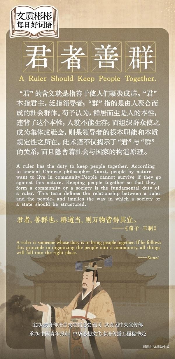 君者,善群也。群道当,则万物皆得其宜(《荀子·王制》)(“君”的含义就是善于使人们凝聚成群。组织社会群体的原则恰当,那么万事万物就都能得到适当的安置。)