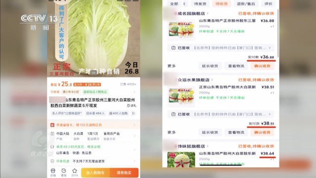 自家的店铺本来卖的25.8元普通大白菜,却被三家别的商家包装成胶州大白菜分别加价到36.88元、38.51元和38.64元卖给了记者。说到这些,这位店家也是颇为无奈。
