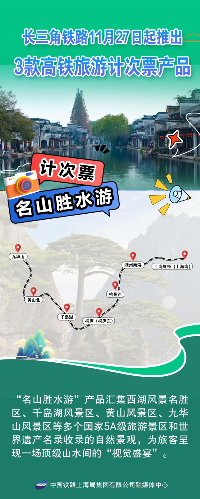 此次推出的“畅游沪宁杭”“名山胜水游”“水乡画卷游”等3款旅游计次票产品,涉及宁杭高铁、沪苏湖高铁、杭温高铁、杭黄高铁、沪宁城际等5条高铁线路的26座车站,以“1次购买、分段乘坐、15天有效”的全新组合售卖模式,为广大旅客提供便利、优惠、自由的乘车新体验。“畅游沪宁杭”产品通过将上海、南京、杭州等长三角核心城市与苏州、无锡、溧阳、湖州、嘉兴等江南水乡城市“串珠成线”,让旅客深度体验长三角的繁华与古朴。“名山胜水游”产品汇集西湖风景名胜区、千岛湖风景区、黄山风景区、九华山风景区等多个国家5A级旅游景区和世界遗产名录收录的自然景观,为旅客呈现一场顶级山水间的“视觉盛宴”。“水乡画卷游”产品一路集齐古镇(南浔)、影视(横店影视基地)、江海(楠溪江、东海)等人文元素,让旅客犹如在一幅江南画卷中穿行。
