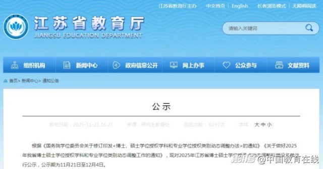 近日,江苏省教育厅发布公示,根据《国务院学位委员会关于修订印发<博士、硕士学位授权学科和专业学位授权类别动态调整办法>的通知》《关于做好2025年江苏省博士硕士学位授权学科和专业学位类别动态调整工作的通知》,现对2025年江苏省博士硕士学位授予点动态调整拟增设名单进行公示,公示期为11月21日至12月4日。