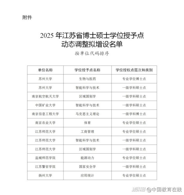 名单显示,苏州大学、南京航空航天大学、中国矿业大学、南京信息工程大学、南京农业大学、江苏师范大学、盐城师范学院、江苏警官学院、扬州大学9所高校拟增设博士硕士学位授予点。
