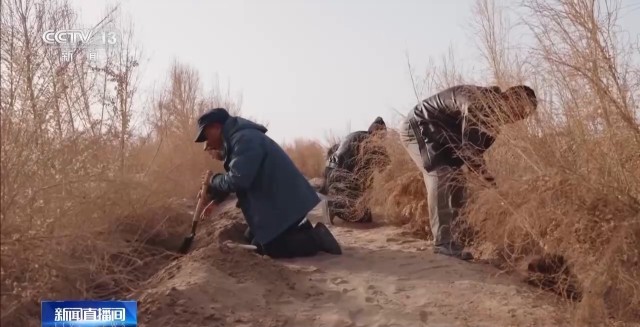 新疆喀什莎车县林草局生态修复股股长 艾斯喀尔·达吾提:我们已经干了一万亩草方格,去年干了三千亩,我们这块48公里的长度,南连叶城县交界,北连麦盖提县交界,我们都已经连上了。今年的任务是7000亩,因为只有草方格能把流动沙丘能挡住。