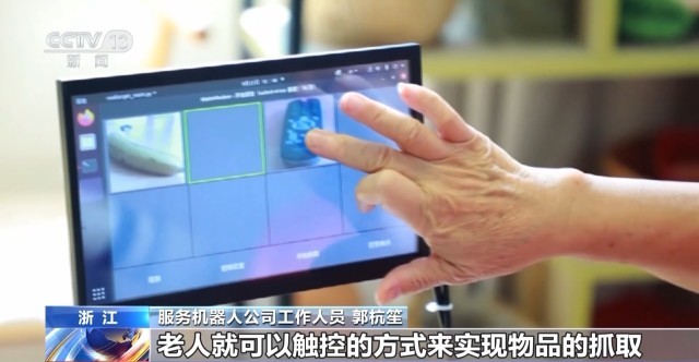 服务机器人公司工作人员 郭杭笙:前前后后进行了11次的迭代升级,我们还搭配了屏幕,老人就可以用触控的方式来实现对物品的抓取。