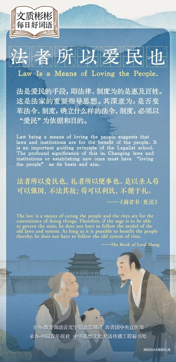Law being a means of loving the people suggests that laws and institutions are for the benefit of the people. It is an important guiding principle of the Legalist school. The profound significance of this is: Changing laws and institutions or establishing new ones must have "loving the people" as its basis and aim.