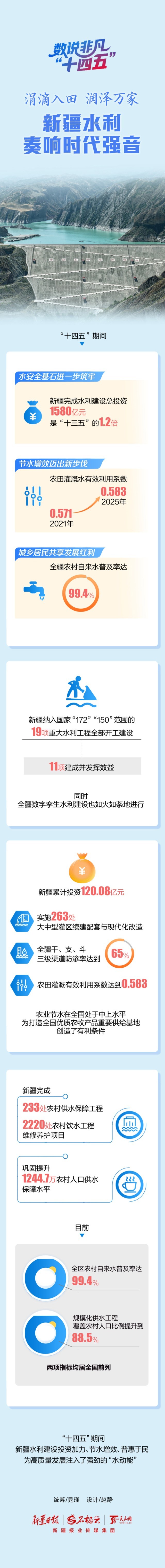 “十四五”期间,新疆完成水利建设总投资1580亿元,是“十三五”的1.2倍,水安全基石进一步筑牢;农田灌溉水有效利用系数由2021年的0.571提高到2025年的0.583,节水增效迈出新步伐;全疆农村自来水普及率达99.4%,城乡居民共享发展红利。