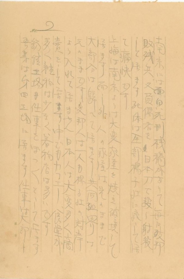 “南京有一座很有意思的死刑栈桥,每天都在用日本刀斩杀或射杀中国败残兵或伤兵,并且把尸体全部抛入扬子江冲走,真痛快”,这是侵华日军国崎支队步兵第四十一联队士兵村田芳夫于1938年1月8日写给父亲的信件,共4页,用铅笔书写,系纪念馆从日本学者渡边久志处征集。