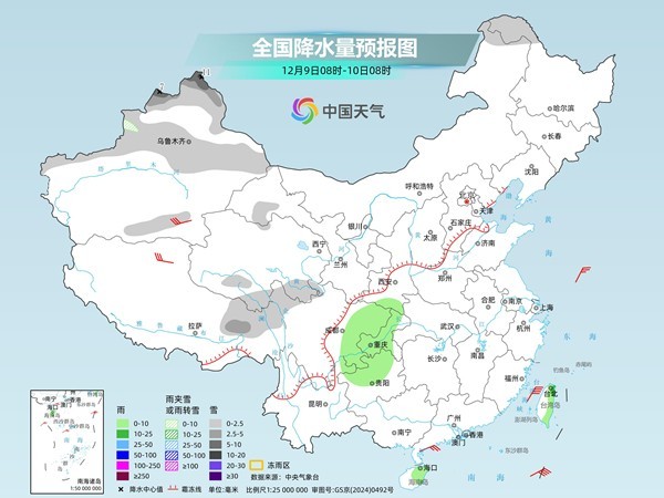 中央气象台预计,今天,黑龙江北部和东南部、新疆北部、西藏中北部和西部、青海南部等地部分地区有小雪或雨夹雪,其中,新疆北疆北部和伊犁河谷等地部分地区有中到大雪。西南地区东北部、云南东北部、台湾岛等地部分地区有小到中雨,其中,台湾岛东北部局地有大雨。