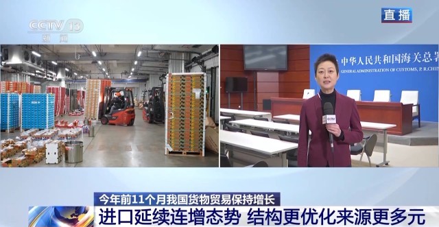 海关总署今天对外公布,今年前11个月,我国货物贸易保持增长,进出口总值41.21万亿元,同比增长3.6 %。我国货物贸易进出口有哪些重点和亮点?如何看待这份成绩单?一起来听记者解读。