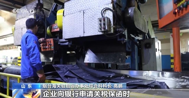 烟台海关驻招远办事处综合科科长 高鹏:我们对橡胶原料进口优先适用“关保通”便利化通关模式,企业向银行申请关税保函时,银行免抵押、免收保证金和手续费,进口税费的缴纳也可以“一月一结”。