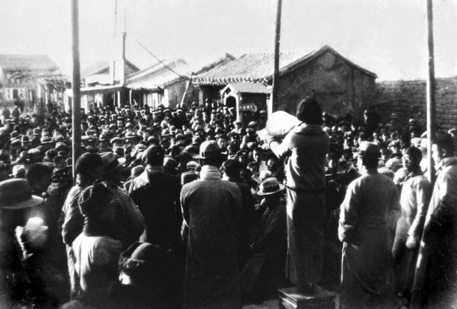 被军警挡在北平西直门外的近2000名学生,就地召开群众大会,发表抗日演讲(资料照片)。