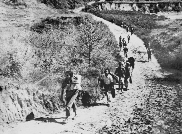 “一二·九”运动以后,大批革命青年响应党的号召,到农村去,到延安去,和工农群众、和革命的武装结合起来,为抗日战争做出巨大的贡献(资料照片)。