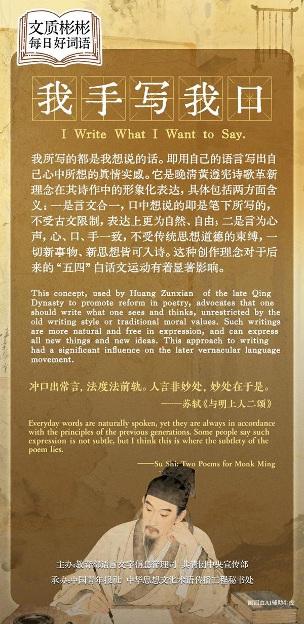 This concept, used by Huang Zunxian of the late Qing Dynasty to promote reform in poetry, advocates that one should write what one sees and thinks, unrestricted by the old writing style or traditional moral values. Such writings are more natural and free in expression, and can express all new things and new ideas. This approach to writing had a significant influence on the later vernacular language movement.