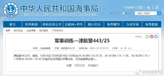 据中国海事局网站消息,大港海事局发布航行警告,12月16日10时至19日15时,渤海部分海域进行军事训练,无关船舶禁止驶入。