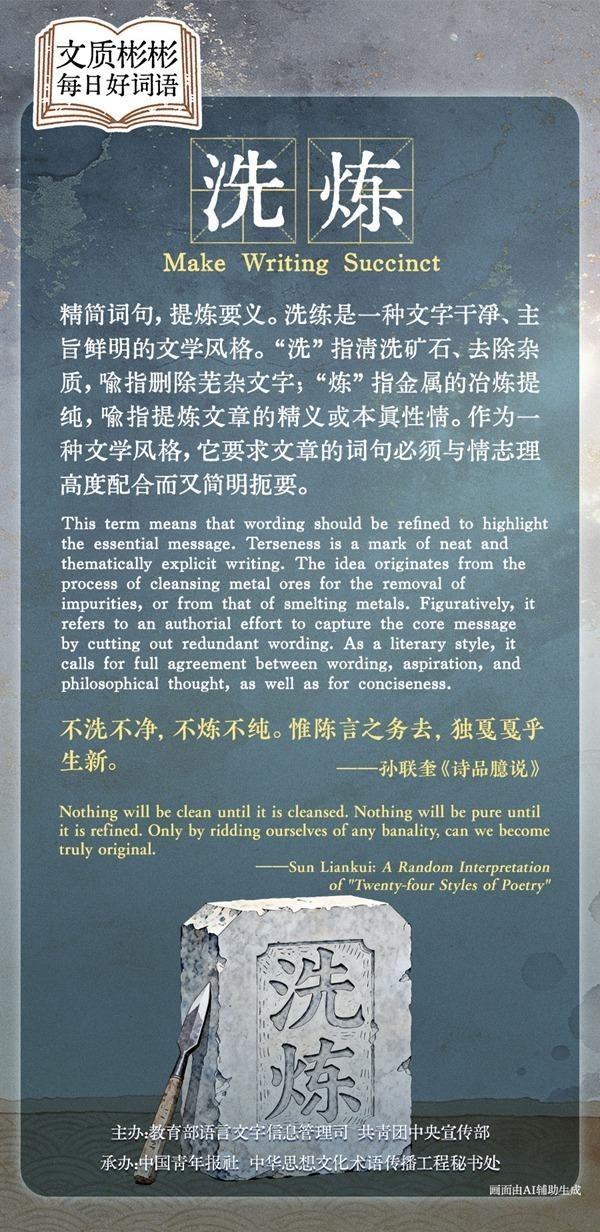 精简词句,提炼要义。洗炼是一种文字干净、主旨鲜明的文学风格。“洗”指清洗矿石、去除杂质,喻指删除芜杂文字;“炼”指金属的冶炼提纯,喻指提炼文章的精义或本真性情。作为一种文学风格,它要求文章的词句必须与情志理高度配合而又简明扼要。
