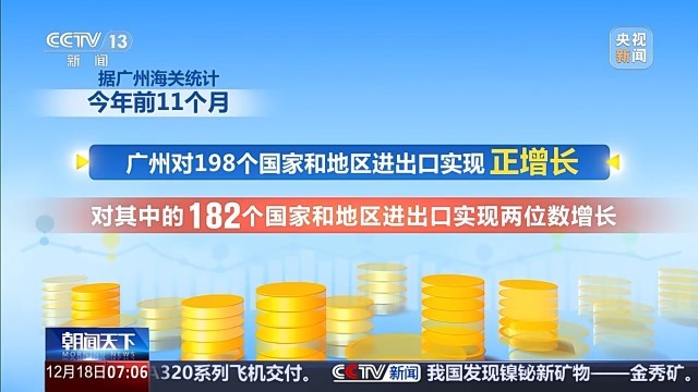 据广州海关统计,今年前11个月,广州对198个国家和地区进出口实现正增长,对其中的182个国家和地区进出口实现两位数增长。