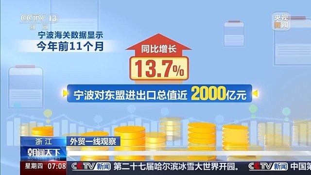 宁波海关数据显示,今年前11个月,宁波对东盟进出口总值近2000亿元,同比增长13.7%。其中,机电产品作为宁波对东盟出口商品中的主力军,前11个月出口了近600亿元,增长22.9%。