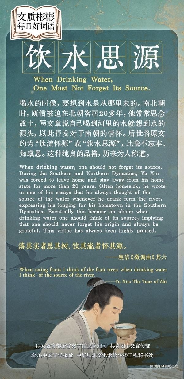 喝水的时候,要想到水是从哪里来的。南北朝时,庾信被迫在北朝客居20多年,他常常思念故土,写文章说自己喝到河里的水就想到水的源头,以此抒发对南朝的情怀。后世将原文约为“饮流怀源”或“饮水思源”,比喻不忘本、知感恩。这种纯良的品格,历来为人称道。