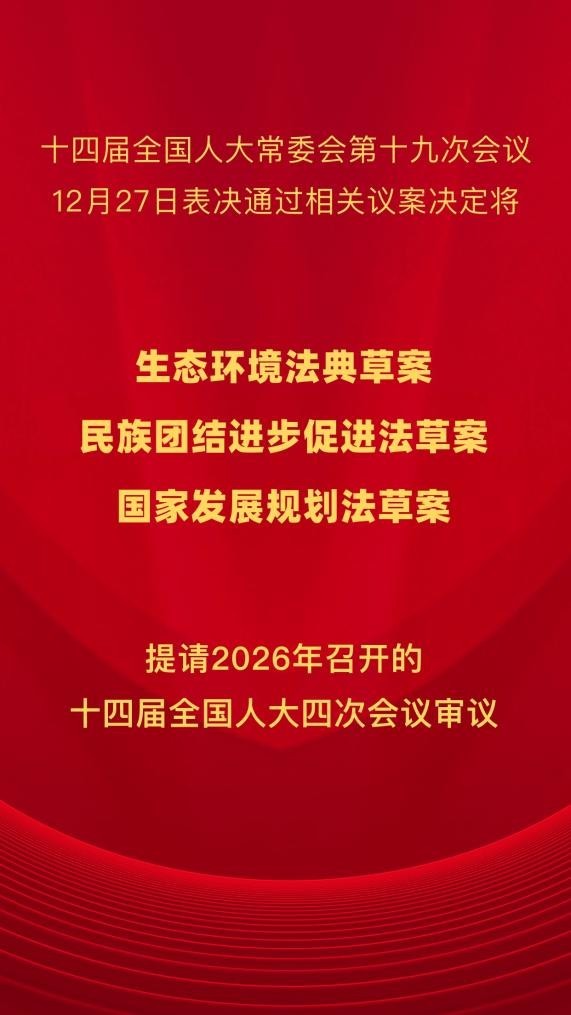 新华社北京12月27日电(记者冯家顺)十四届全国人大常委会第十九次会议12月27日表决通过相关议案,决定将生态环境法典草案、民族团结进步促进法草案、国家发展规划法草案提请明年召开的十四届全国人大四次会议审议。