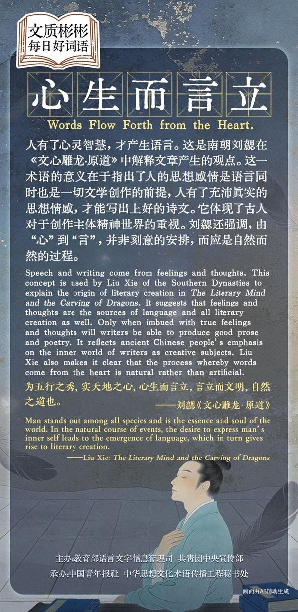 Speech and writing come from feelings and thoughts. This concept is used by Liu Xie of the Southern Dynasties to explain the origin of literary creation in The Literary Mind and the Carving of Dragons. It suggests that feelings and thoughts are the sources of language and all literary creation as well. Only when imbued with true feelings and thoughts will writers be able to produce good prose and poetry. It reflects ancient Chinese people's emphasis on the inner world of writers as creative subjects. Liu Xie also makes it clear that the process whereby words come from the heart is natural rather than artificial.