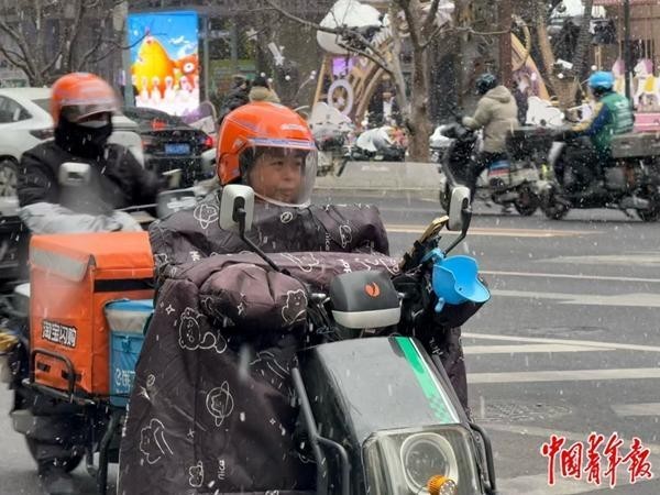 12月12日,北京市朝阳区,一名骑手冒雪配送。刘胤衡/摄