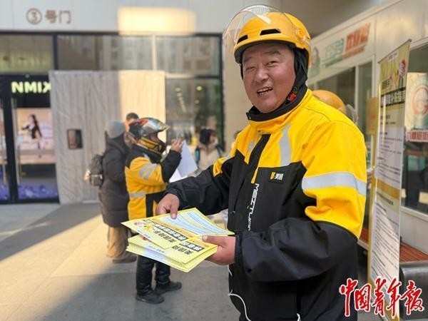 12月11日,北京市通州区,一名骑手在分发平台的社保补贴宣传单。刘胤衡/摄