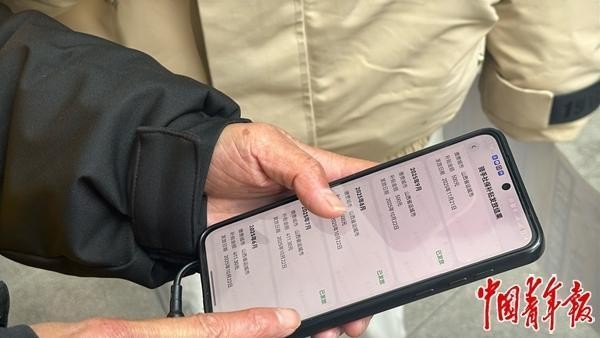 12月11日,北京市通州区,一名骑手在手机上查看社保补贴发放的详细信息。刘胤衡/摄