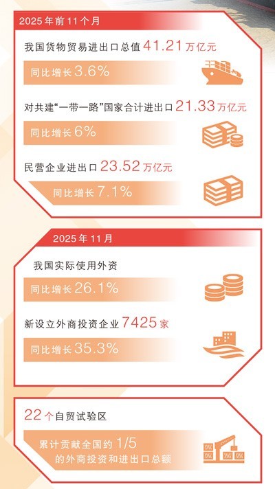 2025年,面对复杂严峻的外部环境,中国外贸逆势而上,实现量稳质升,以稳健的增长展现充沛的活力。2025年前11个月,我国货物贸易进出口总值41.21万亿元,同比增长3.6%。