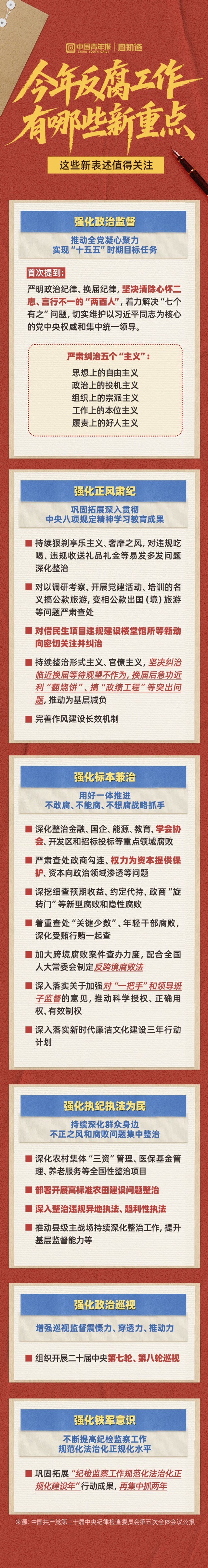 1月14日,中国共产党第二十届中央纪律检查委员会第五次全体会议公报发布。公报从六大方面部署了2026年任务,其中不乏新重点、新表述。在强化政治监督中,纠治五个“主义”,清除心怀二志、言行不一的“两面人”都是首次提到。在深入整治腐败的重点领域的表述上也发生了变化,新增“学会协会”。严肃查处“权力为资本提供保护”,“深入整治违规异地执法、趋利性执法”等,也是新提法。此外,公报还提到,将组织开展二十届中央第七轮、第八轮巡视。公报中还有哪些反腐领域新重点,一图了解。