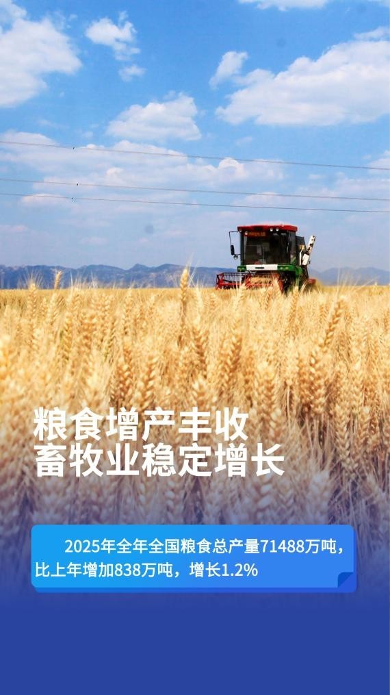 粮食增产丰收,畜牧业稳定增长。全年全国粮食总产量71488万吨,比上年增加838万吨,增长1.2%。其中,夏粮产量14975万吨,下降0.1%;早稻产量2851万吨,增长1.2%;秋粮产量53662万吨,增长1.5%。