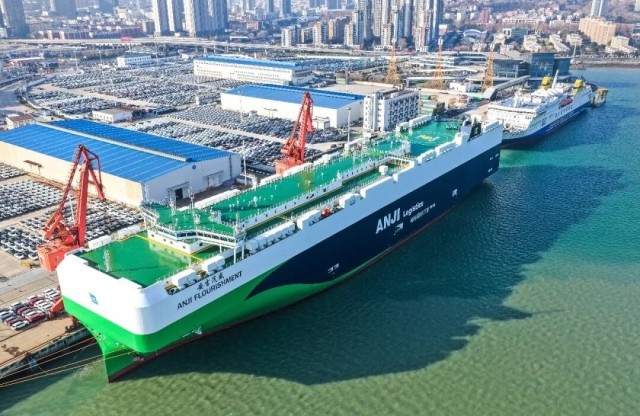 2025年,我国汽车产销量均突破3400万辆,再创历史新高。图为在江苏连云港港口68号泊位,一艘滚装船在装运出口汽车。王健民摄(新华社发)