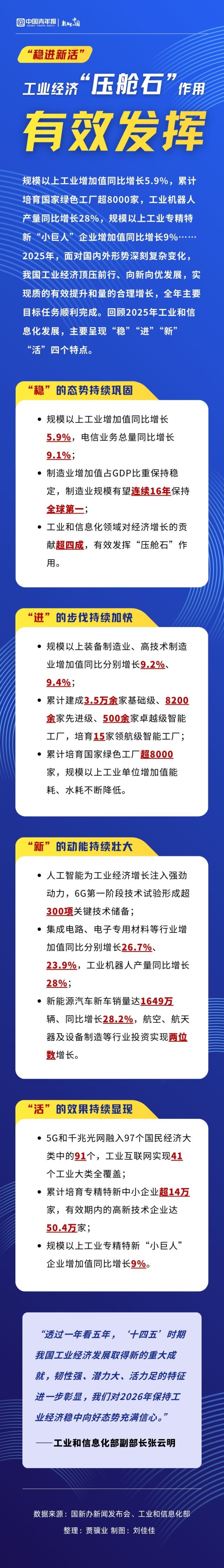 规模以上工业增加值同比增长5.9%,累计培育国家绿色工厂超8000家,工业机器人产量同比增长28%,规模以上工业专精特新“小巨人”企业增加值同比增长9%……2025年,面对国内外形势深刻复杂变化,我国工业经济顶压前行、向新向优发展,实现质的有效提升和量的合理增长,全年主要目标任务顺利完成。1月21日,国新办举行新闻发布会,介绍2025年工业和信息化发展成效。一图速览,2025年工业经济干得怎么样。