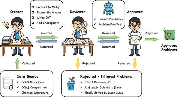 带着这样的疑问,黄志贤和几名志同道合的同学一起调研了现有的化学AI基准测试,发现很多模型“要么太简单,模型分数都快刷满了,没有区分度;要么都是些工具性任务,缺少有化学特色的深度推理”。